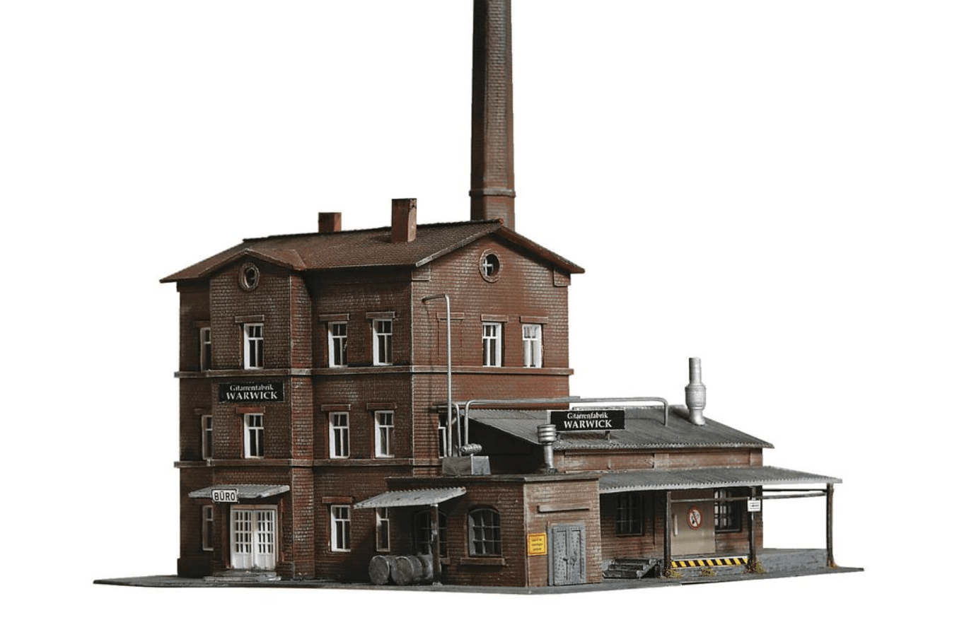 Das Industriegebäude ist durch seine verschachtelte Bauweise und die unterschiedlichen Dachformen besonders attraktiv. Die Laderampe kann durch ein Gleis angeschlossen werden. Zahlreiches Zubehör rundet diesen teilweise gealterten Bausatz ab.