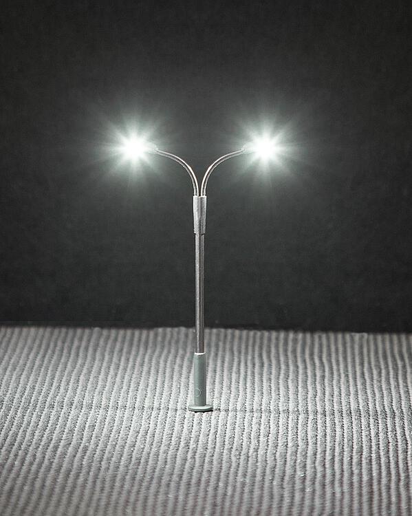 Moderne Peitschenleuchte mit zwei Auslegern. Besonders geeignet zur Ausgestaltung von Stadt-, Straßen- und Industrieszenerien. Der Mast ist aus Metall gefertigt und die Leuchtenhöhe variabel einstellbar. Die filigrane zweiflammige Leuchte ist mit langlebiger LED-Technik ausgestattet. Höhe: 65 mm.
