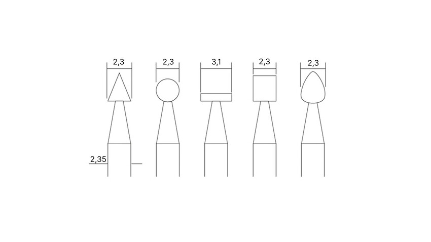 Technische Daten: Schaft: Ø 2,35 mm; Fräskörper Kegel: 2,3 mm; Fräskörper Kugel: 2,3 mm; Fräskörper Zylinder: 2,3 mm; Fräskörper Ellypse: 2,3 mm; Fräskörper Rad: 3,1 mm