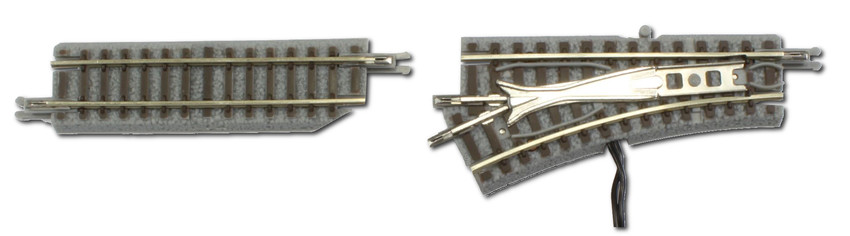 In der Gleisgeometrie von ROKUHAN gibt es zwei Weichengrößen: Länge 110 mm R490-13° und Länge 55 mm R127-26°. Die Weichen können manuell oder elektrisch betrieben werden. Die Antriebe sind dabei direkt in der Gleisbettung untergebracht. Die Herzstücke sind aus Metall und Strom führend. Die intelligenten Stoppweichen des Powerrouting System wirken einem Zusammenstoßen von Zügen entgegen. (Die Stoppweichenfunktion kann ganz einfach über das unterseitige Einbringen von 2 Schräubchen deaktiviert werden.) Die derzeit stärksten Neodym-Magenete sorgen für Durchzugsstärke und Zuverlässigkeit im Langzeitbetrieb. Der Parallelgleisabstand nach Einbau des Gegenbogens beträgt 25mm. Die Bogenweichen im Radius R195 / 220-30° sind demnächst verfügbar. Da es mit der Gleisbettung im Bereich des Übergangs zum Gegenbogen und der Geraden eng wird, hat ROKUHAN in der überarbeiteten Serie bereits ein passend angeschnittenes gerades Gleis (55 bzw. 100 mm) beigelegt, sodass die Weichen einfach und schnell integriert werden können.