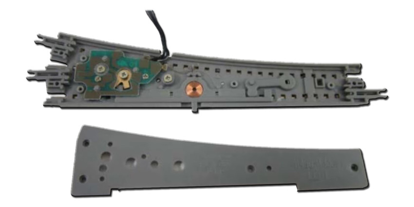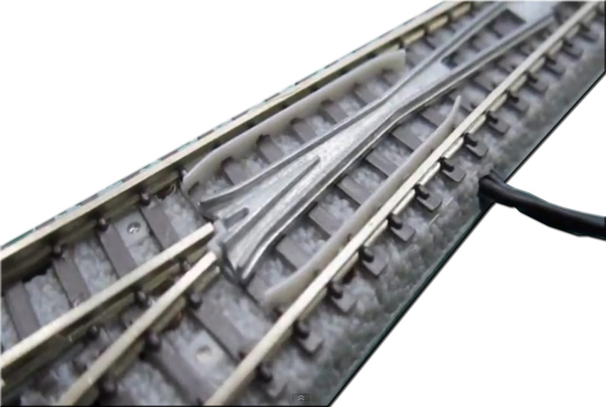 In der Gleisgeometrie von ROKUHAN gibt es zwei Weichengrößen: Länge 110mm R490-13° und Länge 55mm R127-26°. Die Weichen können manuell oder elektrisch betrieben werden. Die Antriebe sind dabei direkt in der Gleisbettung untergebracht. Die Herzstücke sind aus Metall und Strom führend. Die intelligenten Stoppweichen des Power Routing System wirken einem Zusammenstoßen von Zügen entgegen. (Die Stoppweichenfunktion kann ganz einfach über das unterseitige Einbringen von 2 Schräubchen deaktiviert werden.) Die derzeit stärksten Neodym-Magenete sorgen für Durchzugsstärke und Zuverlässigkeit im Langzeitbetrieb. Der Parallelgleisabstand nach Einbau des Gegenbogens beträgt 25mm. Die Bogenweichen im Radius R195 / 220-30° sind demnächst verfügbar. Da es mit der Gleisbettung im Bereich des Übergangs zum Gegenbogen und der Geraden eng wird, hat ROKUHAN in der überarbeiteten Serie bereits ein passend angeschnittenes gerades Gleis (55 bzw. 100 mm) beigelegt, sodass die Weichen einfach und schnell integriert werden können.