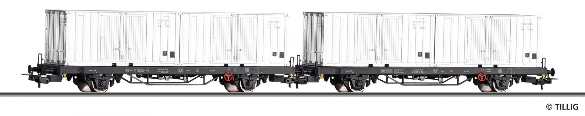 Güterwagenset der Deutschen Post, bestehend aus zwei Containertragwagen Post aa-t/12,8 beladen mit zwei 20' Container