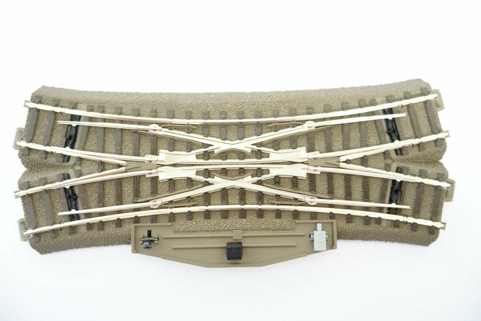Kreuzungsweiche rechts und links verwendbar. Eindeutige Stellung Bogenfahrt oder Durchfahrt. Elektroantrieb und Laterne bereits eingebaut.