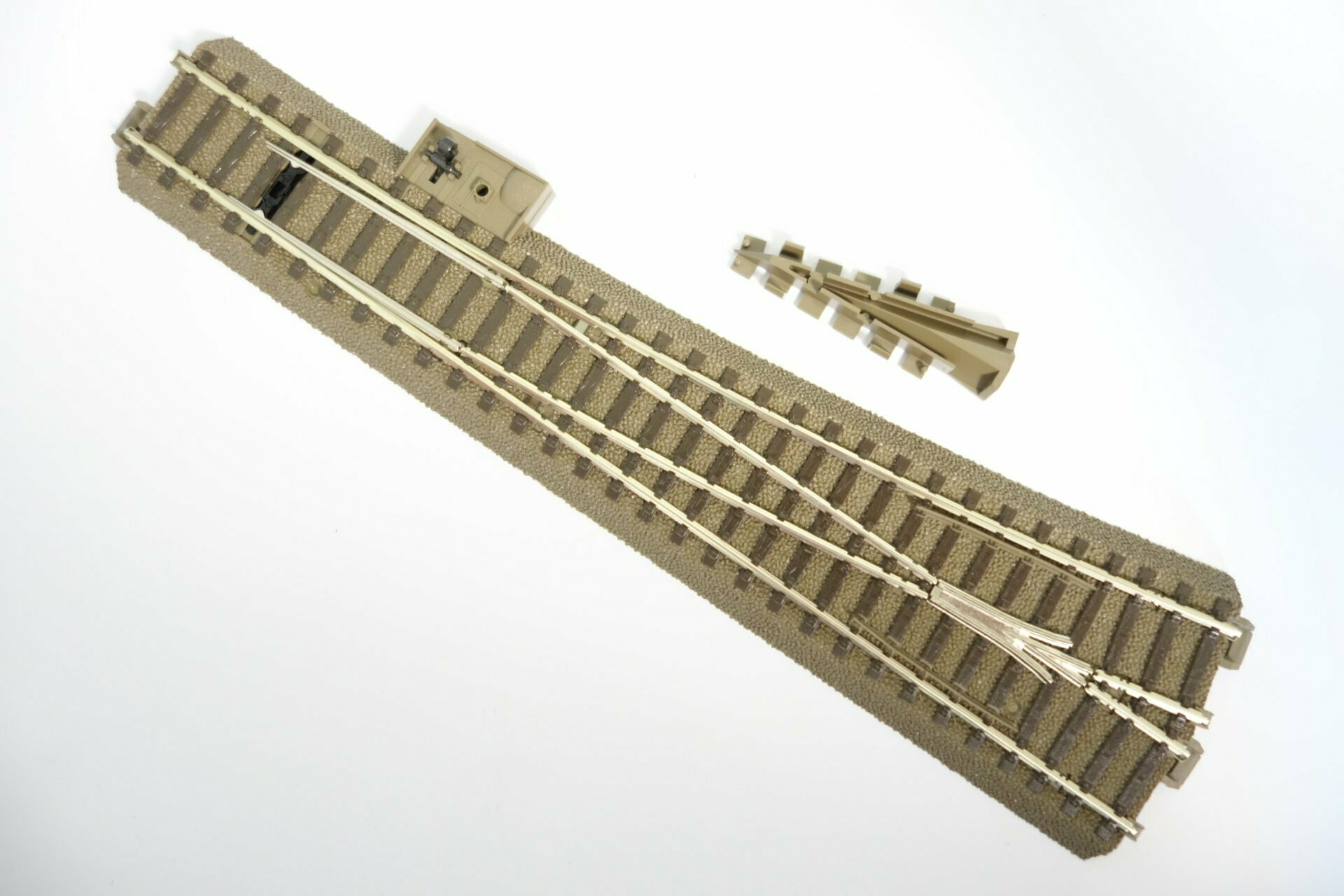 Länge 236,1 mm, Zweiggleisradius 1.114,6 mm. Weichenbogen 12,1°. Polarisierbares 10°-Herzstück aus Metall. Am Ende der Weiche werden 2 Gleise 62071 benötigt, ein passendes Böschungsteil liegt bei. Mit Handschalthebel. Elektroantrieb 74491, Weichenlaterne 74470 und Digital-Decoder 74461 nachrüstbar.