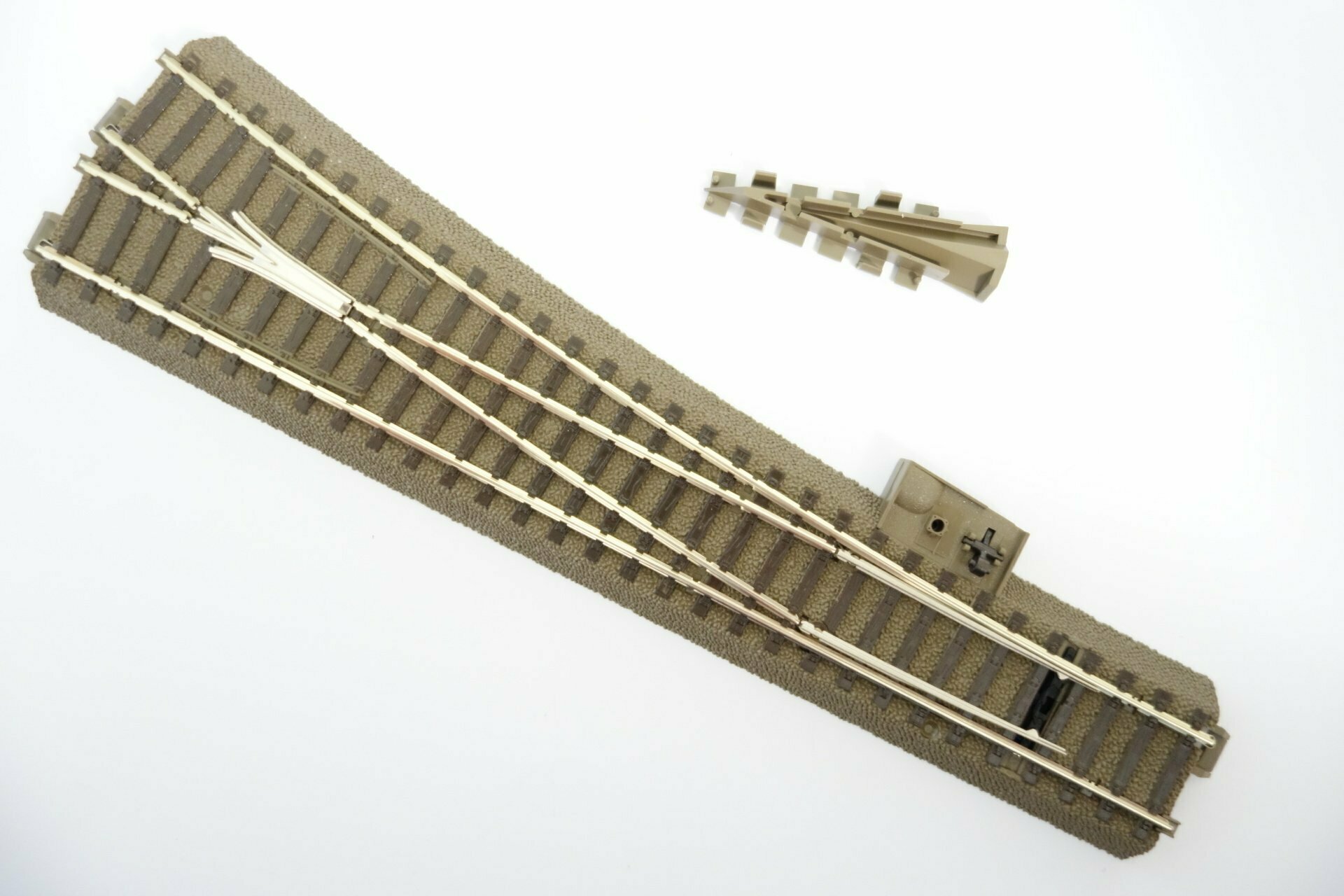 Länge 236,1 mm, Zweiggleisradius 1114,6 mm. Weichenbogen 12,1°. Polarisierbares 10°-Herzstück aus Metall. Am Ende der Weiche werden 2 Gleise 62071 benötigt, ein passendes Böschungsteil liegt bei. Mit Handschalthebel. Elektroantrieb 744901, Weichenlaterne 74470 und Digital-Decoder 74461 nachrüstbar.