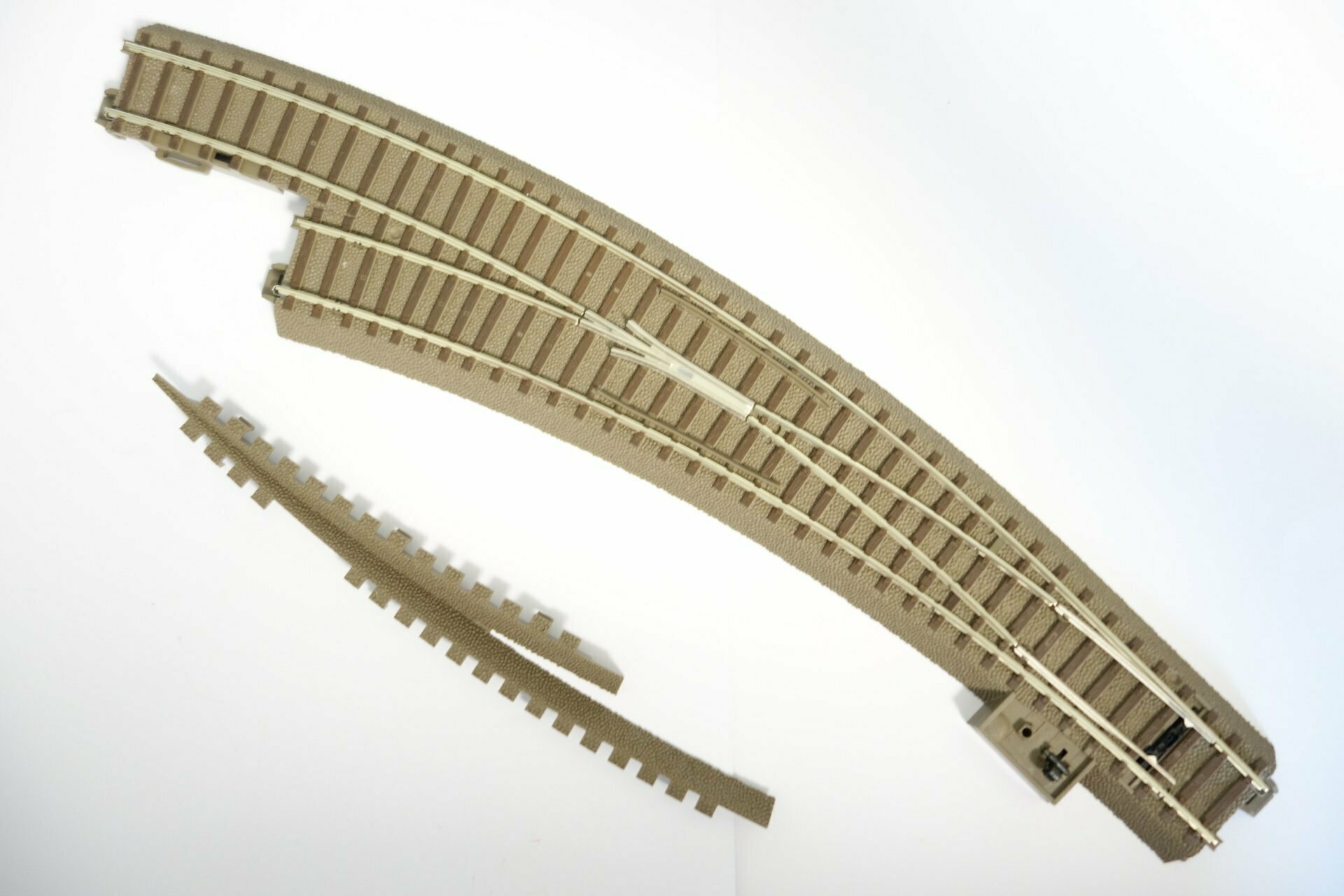 Innenbogen: R3 = 515 mm / 30°. Außenbogen: 30° im Parallelkreisabstand 64 mm. Mit Handschalthebel. Im Innenbogen der Weiche werden 2 Gleise 62315 benötigt, ein passendes Böschungsteil liegt bei. Metall-Herzstück polarisierbar. Elektroantrieb 74491, Digital-Decoder 74461 und Weichenlaternen 74470 nachrüstbar.