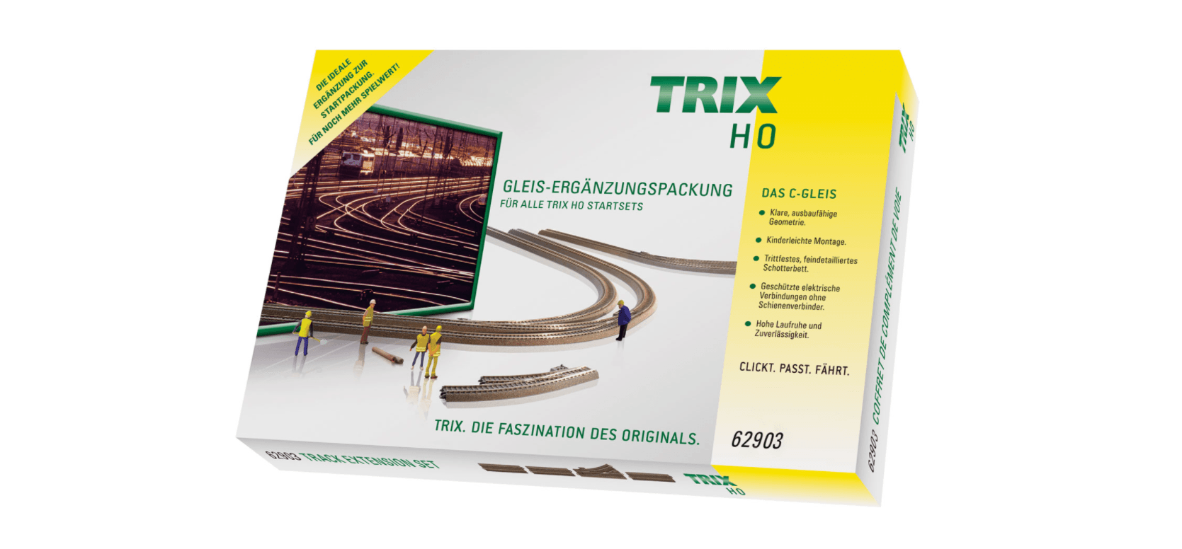 Inhalt: 7 gerade Gleise 62188, 7 gerade Gleise 62172, 2 gebogene Gleise 62130, 1 Bogenweiche 62671, 1 Bogenweiche 62672 und Aufbauanleitung.