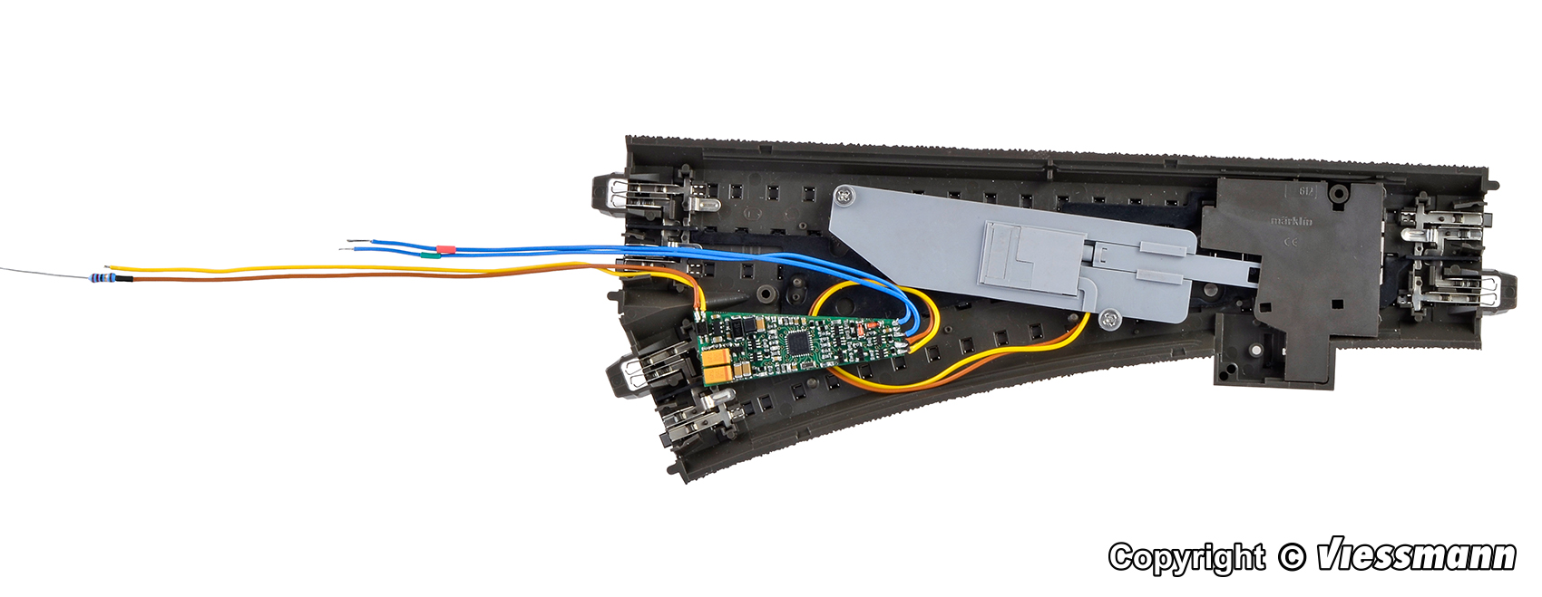 Dieser spezielle Weichenantrieb ist ein kraftvoller, geräuscharmer Antrieb mit zugehörigem Digitaldecoder zum Einbau in Märklin und Trix C-Gleissystemweichen. Der Decoder befindet sich als Baugruppe im Kabel, daher ist der Antrieb besonders kompakt. Der Weichenantrieb zeichnet sich durch vorbildgerecht langsame Bewegung der Weichenzungen aus. Geschwindigkeit und Bewegungsablauf sind elektronisch gesteuert und gewährleisten einen feinfühligen Antrieb. Wenn aufgrund der Eigenschaften Ihrer Weiche die Bewegungsrichtung nicht mit der Schaltrichtung auf Ihrem Eingabegerät übereinstimmt, können Sie im Digitalbetrieb die Stellrichtung des Antriebs invertieren. Der zugehörige Decoder versteht die Formate Märklin-Motorola und DCC und kann die angeforderte Soll- oder Ist-Stellung per RailCom an geeignete Digitalzentralen, z. B. Viessmann Commander Art. 5300/5320, zurückmelden. Er kann aber auch analog betrieben werden. Zusätzliche Schaltausgänge für Relais oder LEDs sowie für konventionelle Stellungsrückmeldung und Herzstückpolarisation vervollständigen den Funktionsumfang. Deren Funktion ist konfigurierbar.