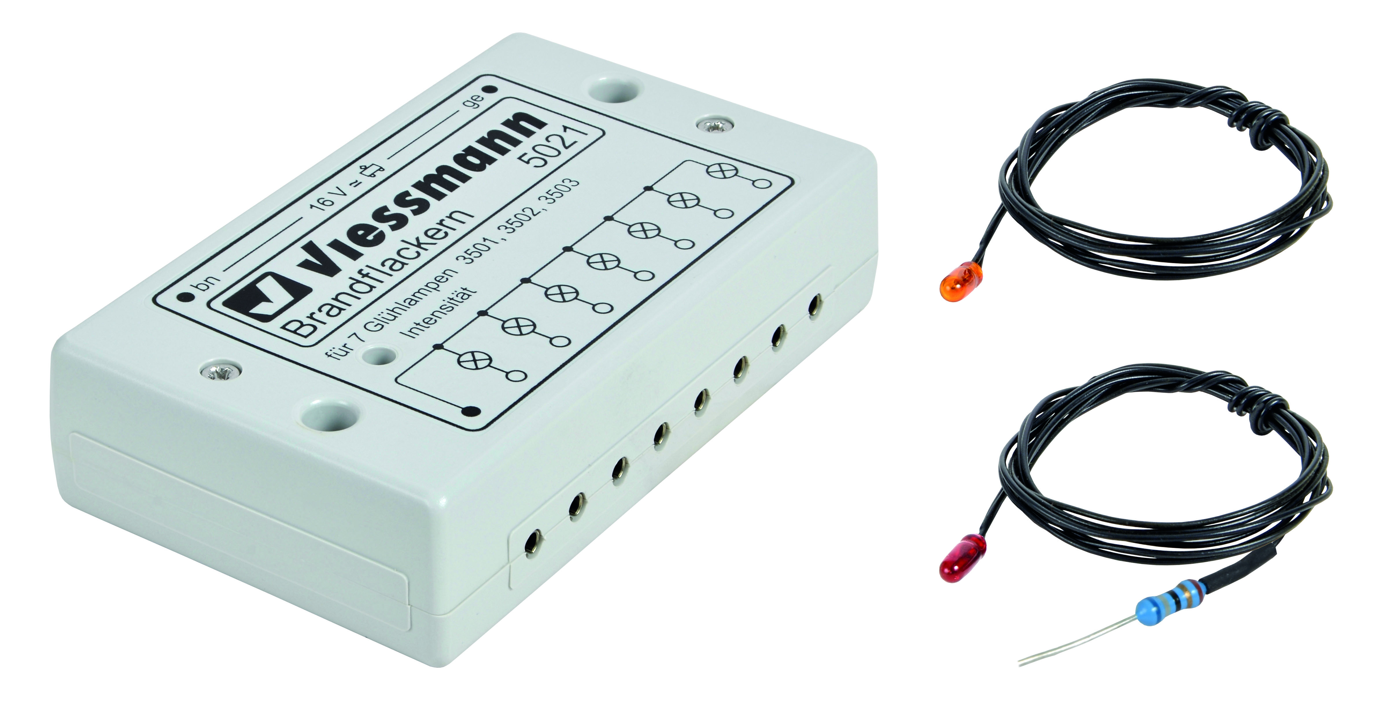 Das Brandflackern erzeugt den sehr realistischen Effekt eines lodernden Feuers. Bis zu 7 rot und gelb leuchtende Miniaturglühlampen flackern jeweils in unterschiedlichem Rhythmus, so dass der täuschend echte Eindruck von brennendem Feuer entsteht. Die Flackerintensität kann stufenlos dem persönlichen Geschmack und dem Anwendungsfall entsprechend eingestellt werden. Folgende Anwendungen bieten sich an: Brennende Häuser, Lagerfeuer (im Wald, am See usw.), Öfen (Schmelzöfen in Industrieanlagen oder sogar für der Backofen im weihnachtlichen Hexenhaus). Im Lieferumfang enthalten sind 2 gelbe und eine rote Glühlampe. Ein Nachrüsten auf bis zu 7 flackernde Lampen ist durch die Glühbirnen Art. 3501 (gelb), 3502 (rot) und 3503 (klar) möglich. Passend zum Lagerfeuer Art. 5022.