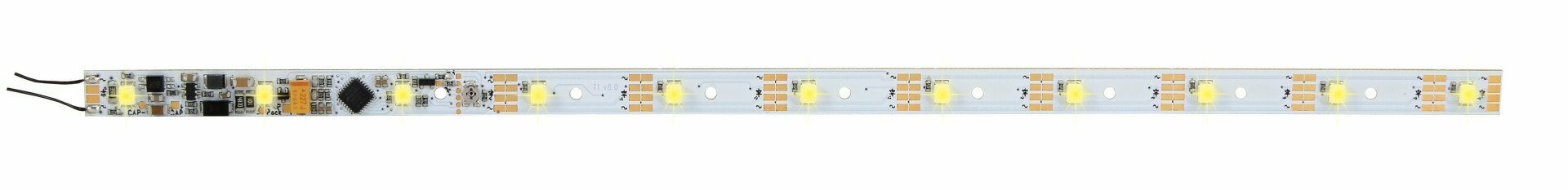 Vielfach teilbare Innenbeleuchtung mit eingebautem Multiprotokoll-Decoder (Motorola/DCC) und 11 wartungsfreien, stromsparenden LEDs und hellem Licht. Helligkeit digital über CVs sowie durch Potentiometer einstellbar. Geeignet für Waggons aller Hersteller, die für Beleuchtung vorgesehen sind. Befestigung der Platinen unter dem Waggondach. Durch Kürzen können die Platinen auf jede Waggonlänge angepasst werden. Integrierter Flackerschutz für gleichbleibendes Licht auch bei kurzen Unterbrechungen der Spannungsversorgung, zusätzliche Stützkondensatoren/Powerpacks anschließbar. Verschiedene Licht-effekte einstellbar, wie Einschaltsimulation von Leuchtstoffröhren oder einzelne flackernde Röhren. Das Modell verfügt über fahrtrichtungsabhängige Schaltausgänge für Stirn- und Schlussbeleuchtung. Ein zusätzlicher Schaltausgang mit bis zu 150 mA Belastbarkeit rundet die Funktionalitäten ab. Die Stromversorgung erfolgt entweder durch am Waggon vorhandene Schleifer/Kontaktsätze oder durch unsere stromführenden Kupplungen Art. 5048/5071. Für Gleich-, Wechsel- und Digitalspannung geeignet. Anschlussmöglichkeit für Zugschlussbeleuchtung, z. B. Art. 5056. Aufgrund des verlustarmen Schaltreglers erwärmt sich die Innenbeleuchtung nur wenig. Stromaufnahme ca. 20 mA. Maße: L 25,4 x B 0,8 cm.