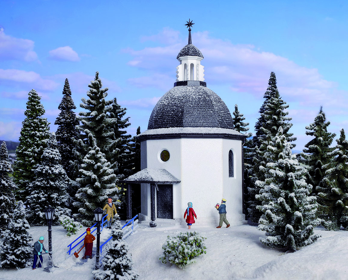 Weihnachten ohne das Lied Stille Nacht! Heilige Nacht! ist schlichtweg nicht vorstellbar. Am 24. Dezember 1818 führte der Dorfschullehrer und Organist Franz Xaver Gruber und der Hilfspriester Joseph Mohr in der Kirche St. Nikolaus in Oberndorf bei Salzburg dieses Weihnachtslied erstmals auf. Zur Jahrhundertwende wurde die Kirche St. Nikolaus abgerissen und an ihrer Stelle die Stille-Nacht-Gedächtniskapelle errichtet. Die Original Stille-Nacht Gedächtniskapelle im Maßstab 1:87 H0 von Vollmer ist ein Bausatz mit vielen Extras wie z. B. einer Sockelbirne und Kunstschnee. Maße: L 11 x B 8 x H 16 cm.