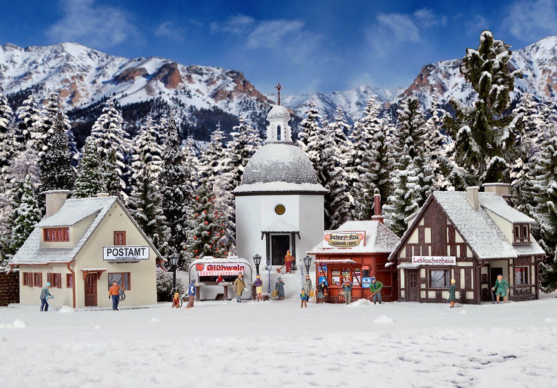 Das Weihnachtsdorf passt hervorragend auf Modellbahnanlagen mit Winterstimmung. Oder gestalten Sie mit Ihren Kindern und Enkeln im Rahmen vorweihnachtlicher Bastelabende ein festliches Diorama. Die Häuser sind auch als Dekoration auf dem Fenster- oder Kaminsims eine Augenweide. Das Dorf besteht aus der Stille-Nacht-Gedächtniskapelle, einem Postamt Christkindl, Glühweinstand, Lebkuchenhaus und Bratwurst-Maxe. Der Kapelle, dem Postamt und dem Lebkuchenhaus liegt jeweils eine Sockelbirne für die Innenbeleuchtung bei. Außerdem ein Tütchen Kunstschnee zur Gestaltung der winterlichen Atmosphäre. Maße: Kapelle L 11 x B 8 x H 16 cm, Postamt L 10,5 x B 9,7 x H 8,3 cm, Lebkuchenhaus L 10,5 x B 9,7 x H 8,3 cm, Bratwurst-Maxe L 6 x B 6,5 x H 7,8 cm, Glühweinstand L 6,2 x B 6,3 x H 3,3 cm.