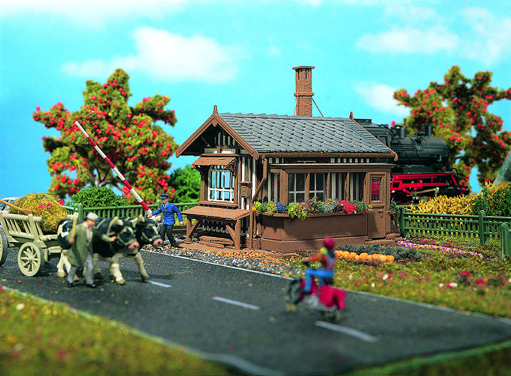 Klein aber fein! Das Schrankenwärterhaus passt an jeden Bahnübergang bis zur Epoche III und IV. Erst mit der Welle umfassender Elektrifizierung der Bahn wurden die Schrankenwärter nicht mehr benötigt. Trotzdem sieht man auch heute noch viele dieser lieblichen Häuschen. Maße: L 9,1 x B 8,2 x H 7,2 cm.