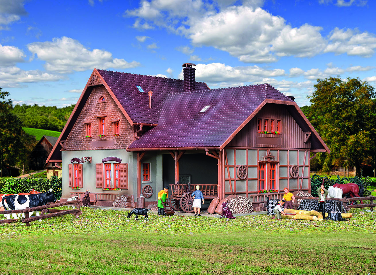 Dieses stattliche Bauernhaus wurde mit liebevollen Details ausgestattet, z. B. Wagenrädern, Holzstapeln, Bänken und vielem mehr. Maße: L 20,5 x B 12,5 x H 12 cm.