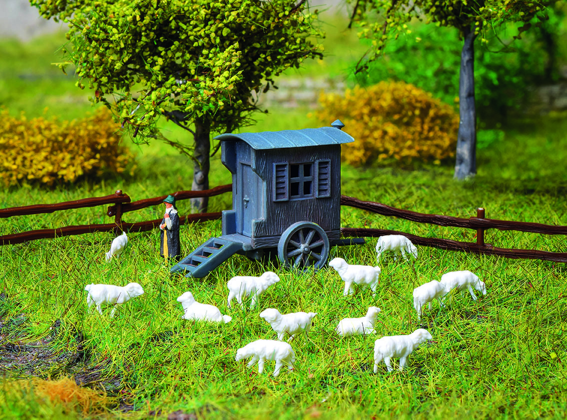 Dem Bausatz liegen 12 Schafe, ein Schäfer, ein Zaun und ein Hund bei. Maße: Schäferwagen: L 3,5 x B 1,5 x H 2,5 cm. Zaun: L 32 x B 0,1 x H 1 cm.