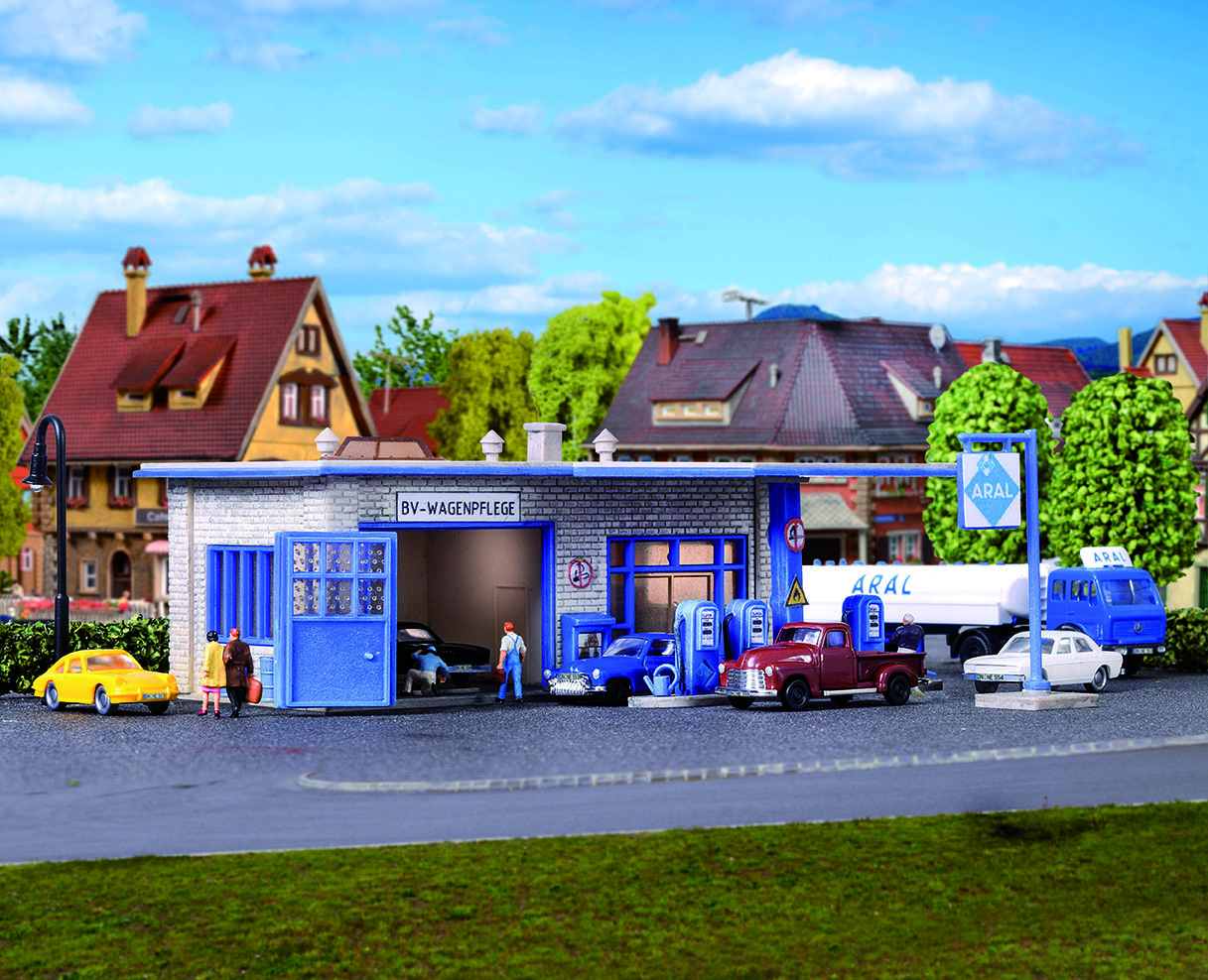 An dieser nostalgischen ARAL-Tankstelle mit integrierter Werkstatt herrscht reges Treiben. Man fühlt sich in die Zeit der 50er und 60er Jahre versetzt. Freundliche Tankwarte sind beim Tanken behilflich und in der Werkstatt wird gleich repariert. Tankstelle mit Zapfsäulen, Verkaufs- und Werkstattraum und vielen weiteren Details. Wir bedanken uns für die freundliche Unterstützung der BP Deutschland und des Historischen Archivs BP/ARAL. Maße: L 10 x B 8,5 x H 4 cm.