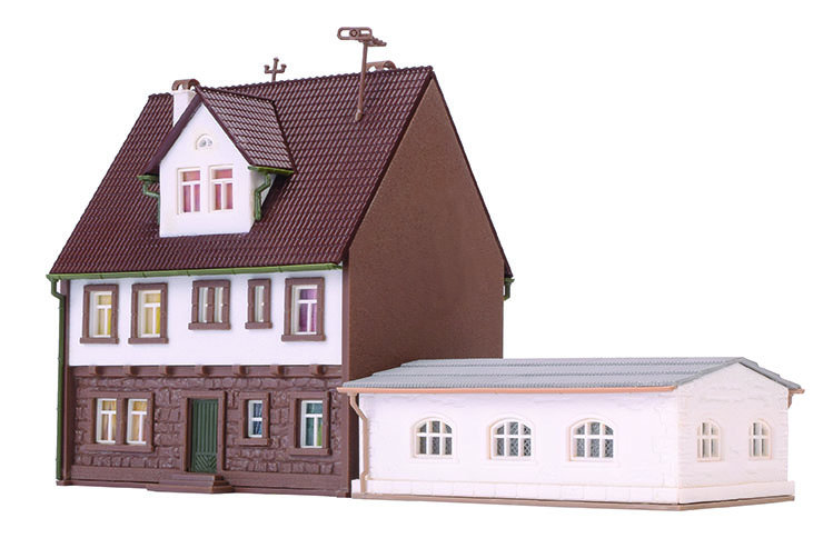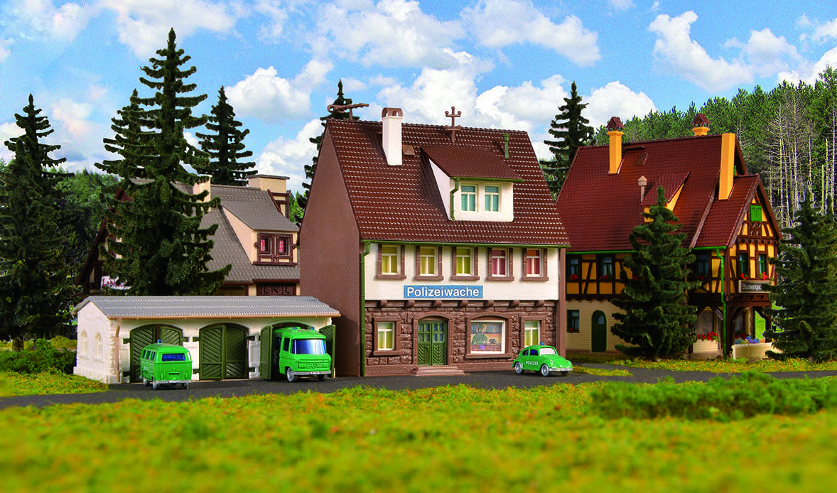 Das zweistöckige Gebäude beherbergt die Polizeiwache einer Kleinstadt. Im Garagenanbau gibt es 3 Stellplätze für die Einsatzfahrzeuge. Maße Polizeiwache: L 8 x B 6,4 x H 9,3 cm. Garage: L 7,5 x B 6,2 x H 2,7 cm.