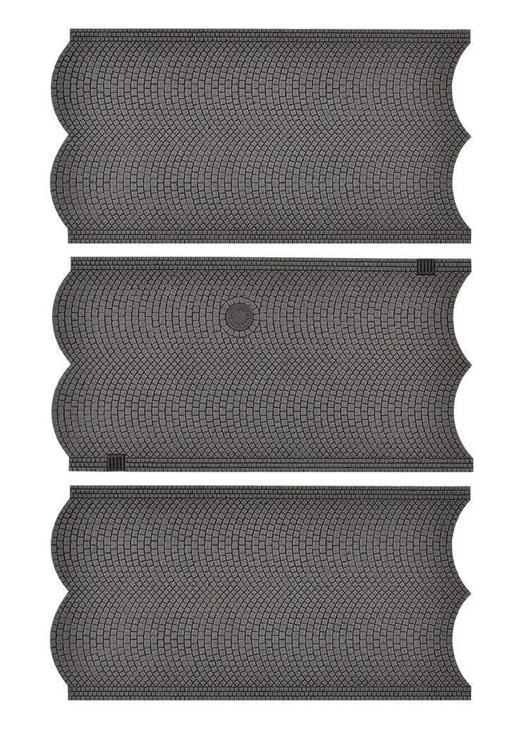 Die Straßenplatten aus der Steinkunst-Serie bestehen aus wetterfestem Sedimentverbundwerkstoff. Dieser Werkstoff erzeugt eine unübertroffen realistische Steinoberfläche. Die Platten sind flexibel und einfach mit einem Cutter-Messer zuschneidbar. Auf einer Platte befinden sich ein Gullideckel und 2 Kanaldeckel, 2 Platten sind ohne Einlage.