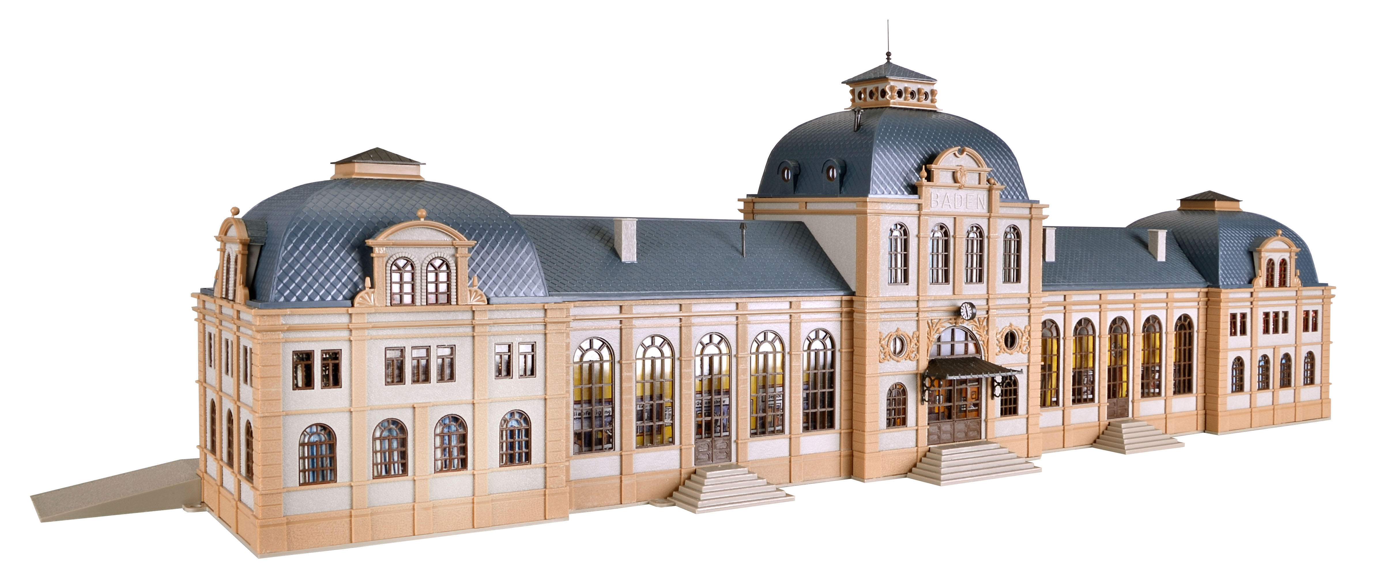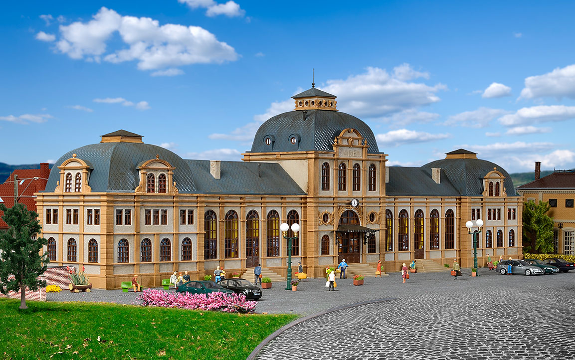 Das Vorbild dieses klassischen, im Jahr 1892 erbauten, Bahnhofs steht in Baden-Baden. Dieses detailgenaue Vollmer-Modell ist ein Muster an Vorbildtreue und Präzision. Der Bahnhof ist für Liebhaber der 2. Bahnepoche. Maße: L 80 x B 16 x H 22,5 cm.