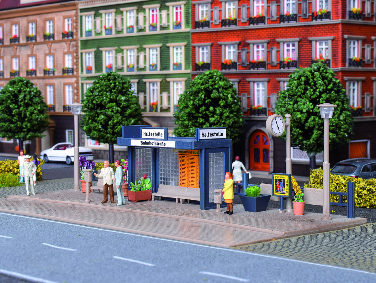Kommt der Bus pünktlich oder hat er wieder Verspätung? Solche kleinen Haltestellen findet man häufig entlang innerstädtischer Buslinien. Eine LED unter dem Dach leuchtet den Wartebereich gleichmäßig aus, die beiden Straßenlampen sind ohne Funktion. L 19 x B 8 x H 5 cm.