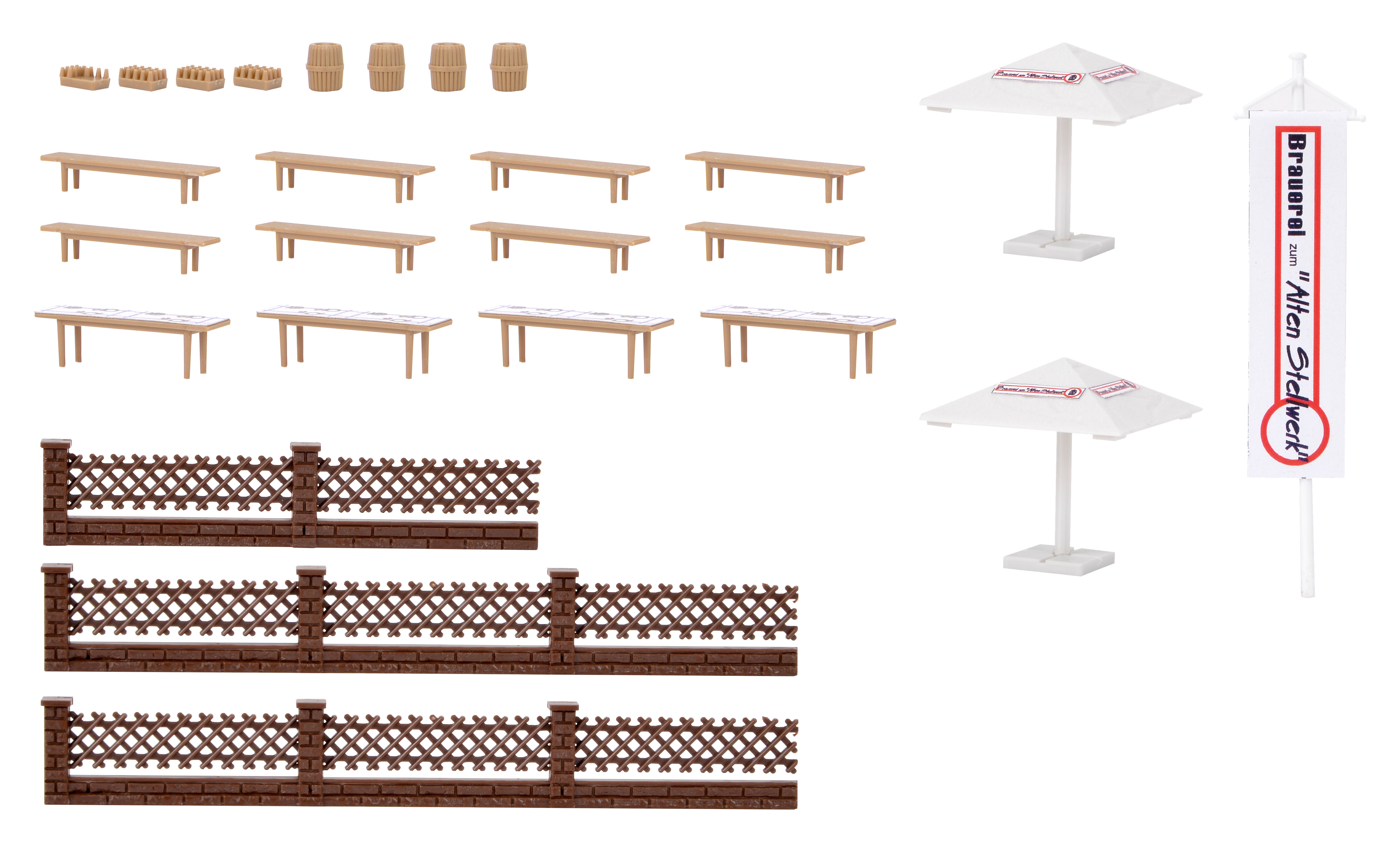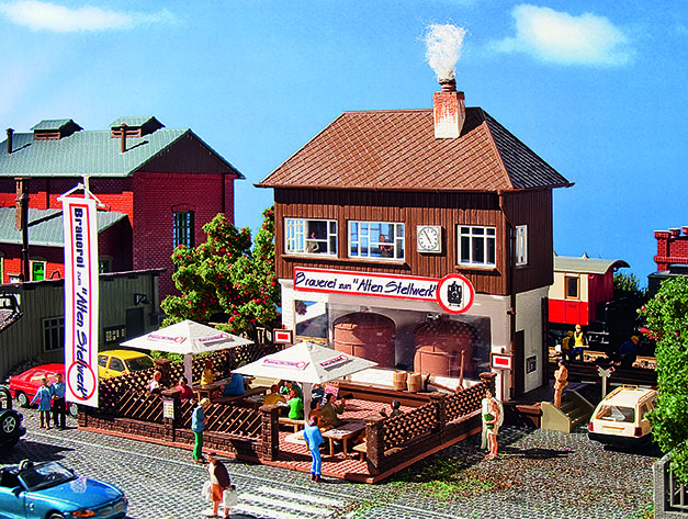 Nachdem die Eisenbahnstrecke stillgelegt worden war, stand auch das alte Stellwerk zum Verkauf. Ein rühriger Wirt hat es sofort gekauft und eine kleine Hausbrauerei eingerichtet. Die Wirtschaft ist nicht sehr groß, hat aber eine tolle Atmosphäre und das Bier schmeckt hervorragend. Bei schlechtem Wetter sitzt man oben, wo früher die Schaltzentrale war, bei gutem Wetter und warmen Temperaturen draußen im Biergarten. Die Sudkessel sind durch die großen Fenster sichtbar. Zum Bausatz gehören das Hauptgebäude, der Biergarten mit Tischen und Bänken, ein Zaun, zwei Brauerei-Sonnenschirme und vieles mehr. Maße: L 15 x B 14 x H 13,6 cm.