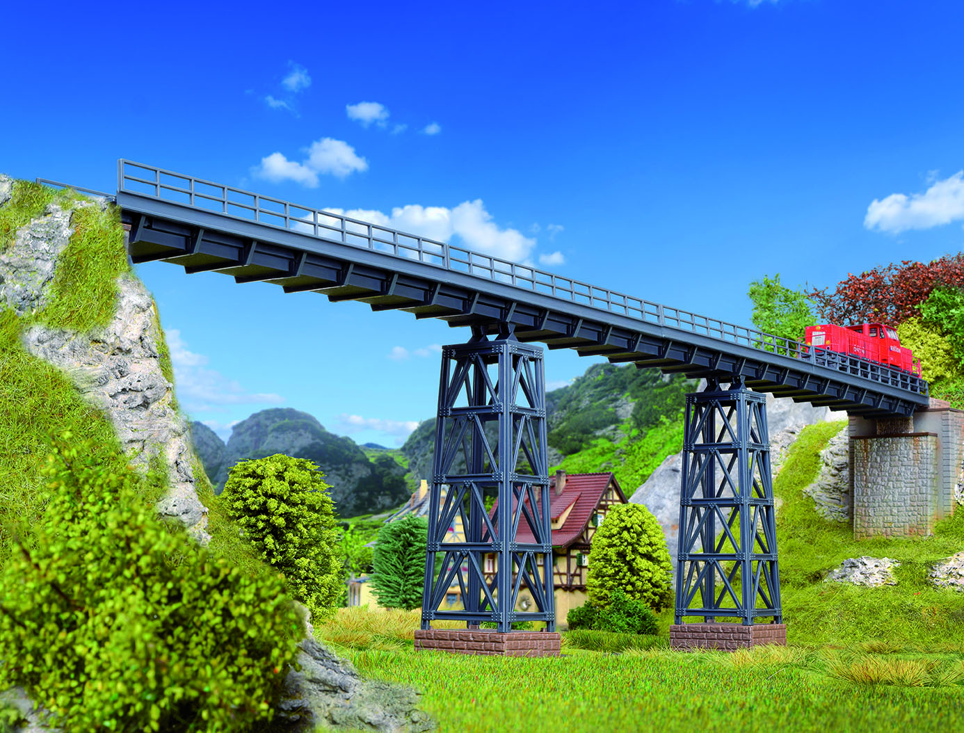 Dieses Viadukt ist ein monumentales Bauwerk. Es wurde in den 30er Jahren errichtet, um den Spitzkehrbahnhof Michaelstein in der Nähe von Halle zu umgehen. Aufgrund seiner Länge ist es besonders zur Überbrückung weiter Täler geeignet. Maße: L 44,5 x B 3,4 x H 11,8 cm, Durchfahrtshöhe: 10,2 cm, Durchfahrtsbreite: 10,8 cm, Fahrbahnhöhe: 10,9 cm, Farbahnbreite: 1,7 cm. Für alle gängigen Gleissysteme geeignet.
