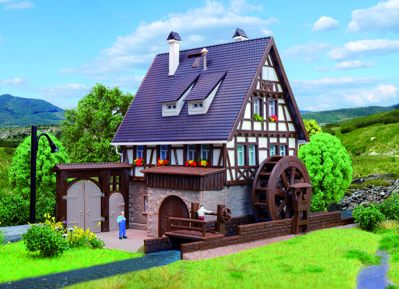 Die fachwerkverzierte Getreidemühle mit Mühlrad und Hoftor liegt an einem kleinen Flüsschen. Sie können wählen, in welcher Epoche sie dieses Thema ansiedeln. Das Mühlrad kann mit dem Motor Art. 44200 angetrieben werden (Zusatzausstattung). Maße: L 14 x B 11,5 x H 10,5 cm.