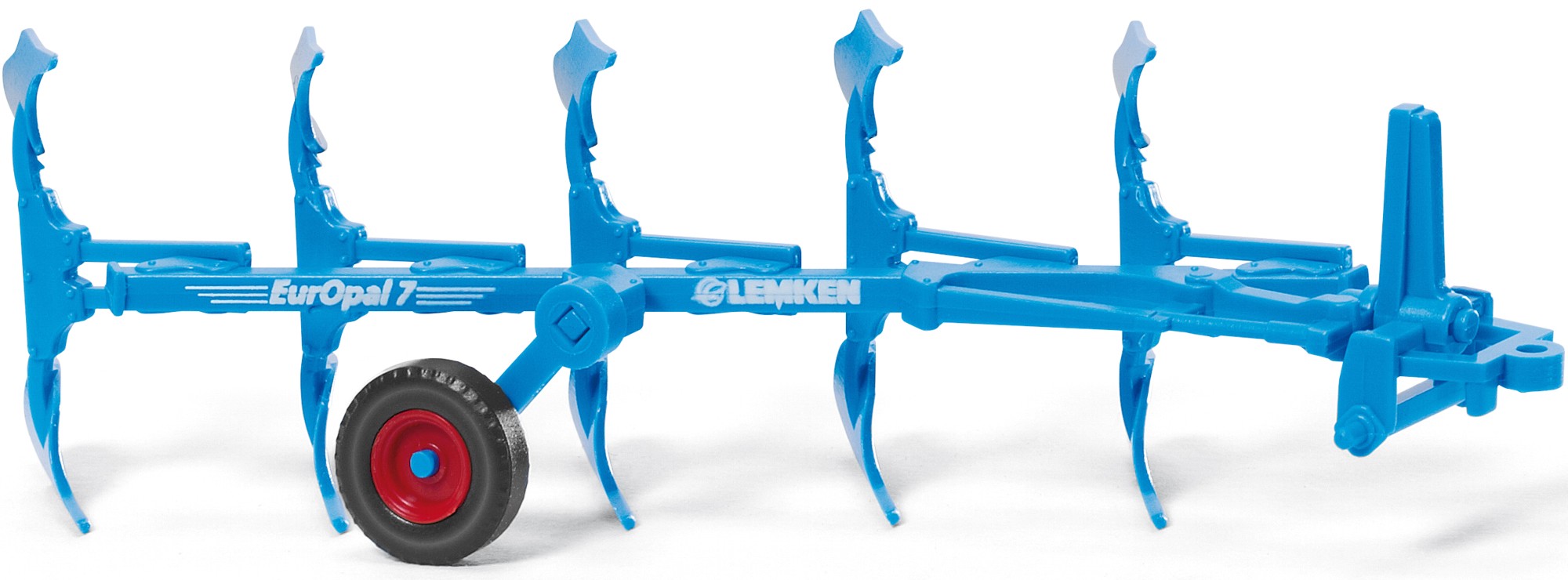 Grundrahmen mit Drehwerk, Achse und Radstrebe in hellblau, Pflugscharen ebenfalls. Felgen in karminrot gehalten. Grundrahmen mit Schriftzug "EurOpal 7" sowie Streifen und "Lemken"-Schriftzug in weiß.