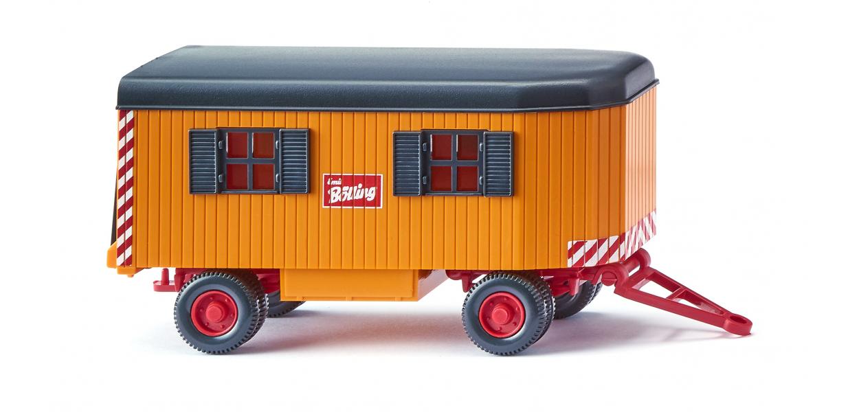 Hofklassiker für Revier-Baufirma Es waren ausrangierte Umzugshänger, meist aus den dreißiger Jahren, die auch die Nachkriegsjahrzehnte überdauerten, weil sie einen neuen Einsatzzweck gefunden hatten. Beim Bauunternehmen Bölling wurde der Bauwagen lange Jahre für Alltagsaufgaben genutzt. Dort, wo sich die Bauarbeiter eine Pause gönnten, wurde dieser ungewöhnliche Anhänger geschätzt. Die Serie nach Vorbildern aus dem Fuhrpark des einst großen Bauunternehmens des Reviers erhält damit weitere Vielfalt. Aufbau narzissengelb, Fahrgestell mit Deichsel und Felgen karminrot, Dach und Fenster anthrazitgrau. Bedruckung mit Firmenschild „Bölling“ mit weißer Typografie auf rotem Grund. Rot-weiße Warnstraffur an Front, Seiten und Heck.