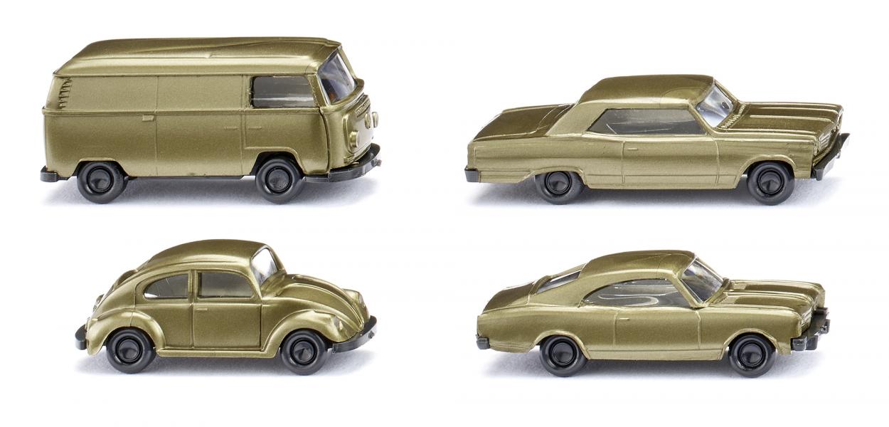 Goldener Auftritt zum Jubiläum der Spur N Kaum zu glauben, dass es schon 50 Jahre her ist, als WIKING still und leise der Spur N wachsende Wertschätzung entgegenbrachte. Alles aus gutem Grund, denn in den 1960er-Jahren hatten die Modelleisenbahner die 160-fache Miniaturisierung der Vorbilder zu schätzen gelernt. Mehr Landschaft, mehr Bahn auf gleicher Fläche wie bei der H0-Bahn. Und selbst wer über wenig Platz verfügte, konnte problemlos respektabele und Spaß machende Modelleisenbahnen gestalten. Die Fahrzeuge dazu stellte seit 1969 WIKING bereit! Schlicht, aber vorbildgerecht versteht sich. Am gemeinsamen Spritzling waren die modellbauerischen Winzlinge gleich im Quartett fixiert – Verglasung und Karosserie wurden einfach aufgesetzt. Das Prinzip erwies sich als ebenso einfach wie alltagstauglich. Auf diese Weise präsentierten sich die Modelle in den Kartons ebenso reizvoll wie übersichtlich. Außerdem waren sie gegen den raschen Verlust gesichert. Zum Jubiläum hat WIKING das Set mit VW Käfer 1300, VW Bus, Opel Rekord und Chevrolet im metallisch anmutenden Gold gespritzt. Ambitionierte WIKING-Freunde werden rasch erkennen, dass der metallische Kunststoff die Fließnähte erkennbar macht – die Farben changieren eindrucksvoll. So dürfte schon bei genauerem Hinsehen jedes Modell ein Jubiläums-Unikat sein! Karosserie von VW Käfer 1300, VW Bus, Opel Rekord und Chevrolet Malibu gold gespritzt. Spritzling mit Fahrgestellen und integrierten Rädern schwarzgrau.
