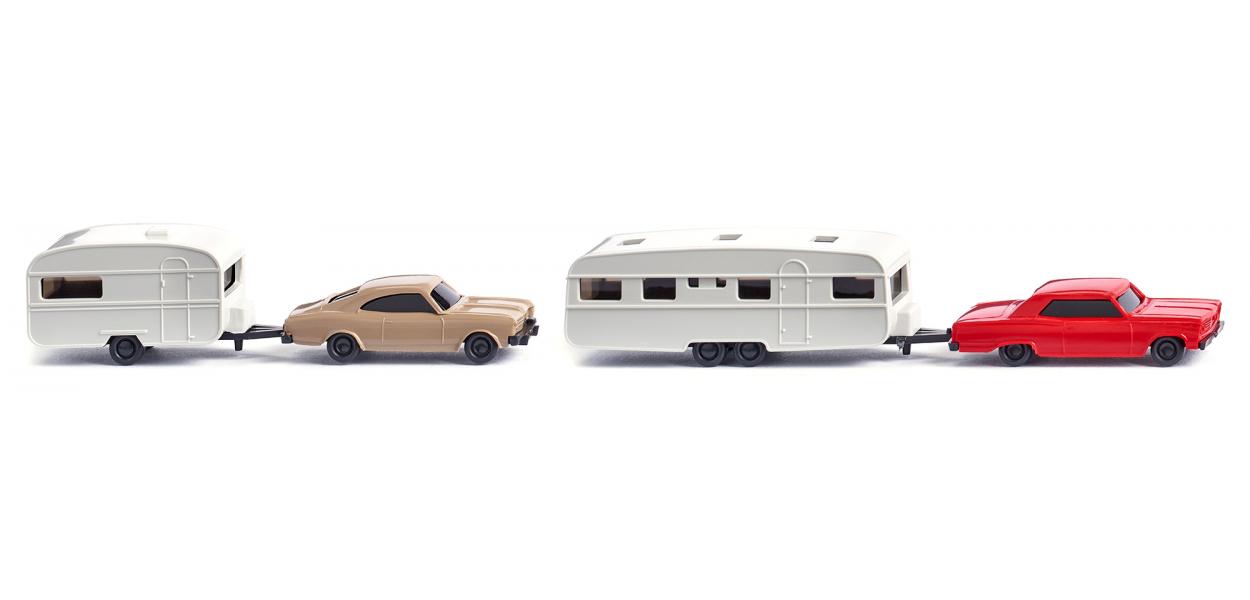So ging’s mit Opel Rekord und Chevrolet Malibu auf Reise Chevrolet Malibu und Opel Rekord Coupé erinnern an die späten sechziger Jahre, ebenso das damals neue Design der Wohnwagen. Die beiden Wohnwagengespanne zählen zu den Modellen der Startphase des N-Spur-Sortiments bei WIKING und erscheinen jetzt mit zwei farblich wechselnden Karosseriefarben. Karosserie von Opel Rekord und Chevrolet Malibu wechselweise in graubeige und rot. Wohnwagen und Reiseanhänger grauweiß. Fahrgestelle für Pkw und Anhänger schwarzgrau. Verglasung topaz.
