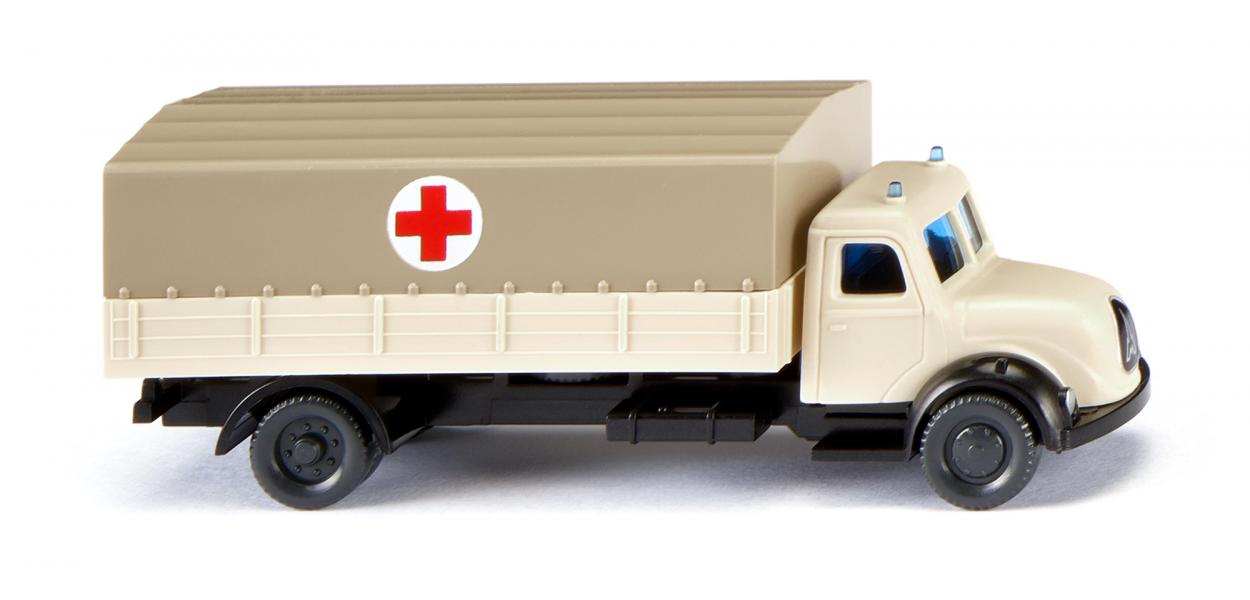 In DRK-Farben für den Katastrophenschutz gerüstet Einst hatte der Magirus-Rundhauber auch seine Aufgaben in Diensten des Deutschen Roten Kreuzes zu verrichten. Vor allem beim Aufbau des Katastrophenschutzes in den 1960er-Jahren fanden zahlreiche Lkw den Weg zu den DRK-Schwerpunktstandorten im ganzen Land. Fahrerhaus und Pritsche elfenbeinhell, Fahrgestell mit Kotflügeln und Inneneinrichtung schwarz. Verdeck cremebeige. Kühlergrill mit schwarzer Grillfläche und silbernem Rahmen sowie Magirus-Logo. Vordere Scheinwerfer silbern bedruckt. Verdeckseiten mit DRK-Logo
